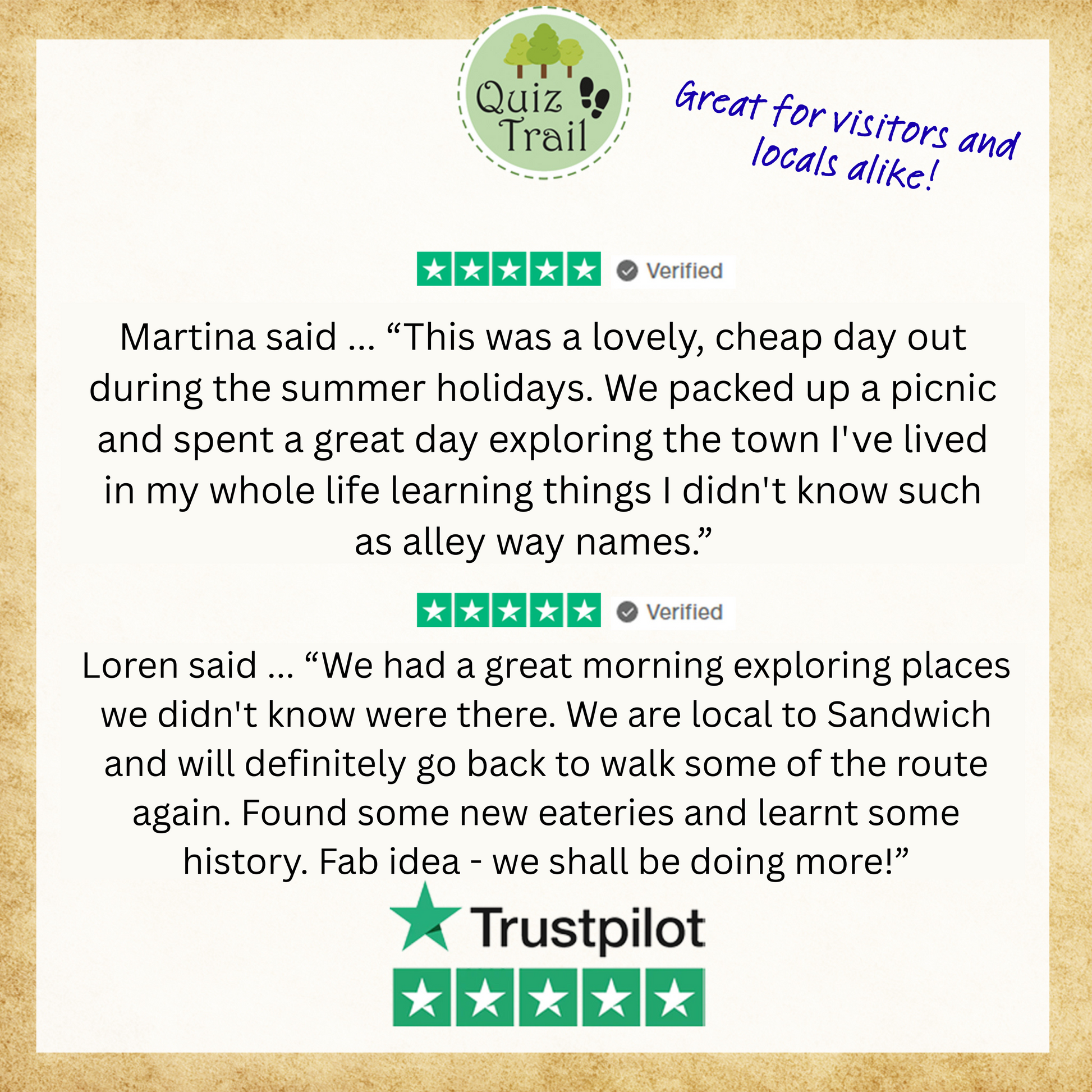 A Quiz Trail is a self-guided walk taking you on a circular route - showing you the highlights. We started making our Quiz Trails from a love of history - each booklet is packed with local history. We are a Mum and two (grown up!) daughters and as a family we'd visit places - walk around the middle bit and go home not having learnt very much about the area. Our trails make sure you see and learn lots more during your visit!